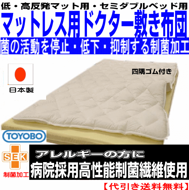 |  楽天感謝祭/病院で使われている低反発専用ドクター 敷き布団 日本製 アレルギー 制抗菌・こ防ダニ・防臭・吸汗 セミダブルサイズ 洗える敷布団 敷きパッドしき 布団 しきふとん ベッドパッドに/送料無料 価格: 9,900円 レビュー評価:4.5 レビュー数:12 【あす楽_土曜営業】 ベッドマットレスなどにそのまま寝るのは不衛生! そんな悩みを解消。。。ベッド専用敷き布団登場 ★店頭で軽くて丸洗いOKのベッド専用敷き布団大好評! ベッドのマットレスの機能を そのままからだに伝えるo(*^▽^*)o すこやかに、ぐっすりと眠りたいです 低反発マットレス用としても最適です。 四隅ゴム付きでベッドにもご使用できます。 「こんなに簡単に取り外し出来ます!」、 「抗菌で清潔、洗えるのが何より一番。。。。」 (こちらはイメージ画像です。) 『ドクターEs かわりました』さらに高性能制菌に! 他社の抗菌敷き布団とちょっと違う制菌敷布団♪ 他社の布団を越えた制菌性 【ドクターEsはセミダブルサイズベッドマット専用敷布団】 『病院採用特殊ファイバー』 医療機関などで認められた高性能制菌機能ファイバー (無機系銀化合物配合) 商品についての詳細はこちらをクリ (更新日時:2018/10/22 00:39) Supported by 楽天ウェブサービス |