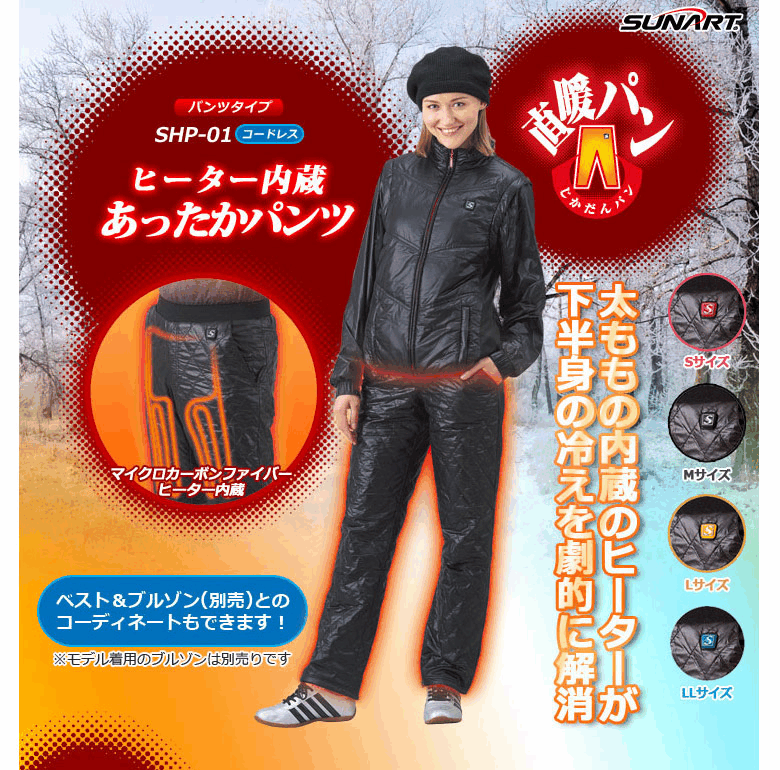 ![]() 価格: 17,280円 レビュー評価:0.0 レビュー数:0 品名:マイクロカーボンファイバーヒーター内蔵あったかパンツ 「直暖パン」 じかだんパン 型式:SHP-01 本体寸法 サイズ/約cmウエストヒップ股上股下裾幅重量(約) Sサイズ77?8999247821.5380g Mサイズ82?9410224.58022.5400g Lサイズ87?99105258223.5420g LLサイズ92?10410825.58424.5440g カラー本体:ブラック スイッチ色: ●ピンク(Sサイズ) ●ブラック(Mサイズ) ●イエロー(Lサイズ) ●ブルー(LLサイズ) バッテリー専用充電式リチウムイオンバッテリー(7.4V / 2600mAh)通常約500回充電 バッテリー寸法W39×D70×H21(mm) ※突起物を除く バッテリー重量約100g(1台) 充電アダプターインジケーター付き(充電時間約2.5時間) 100V?240Vグローバル電圧対応・海 (更新日時:2019/04/17 05:35) Supported by 楽天ウェブサービス |
